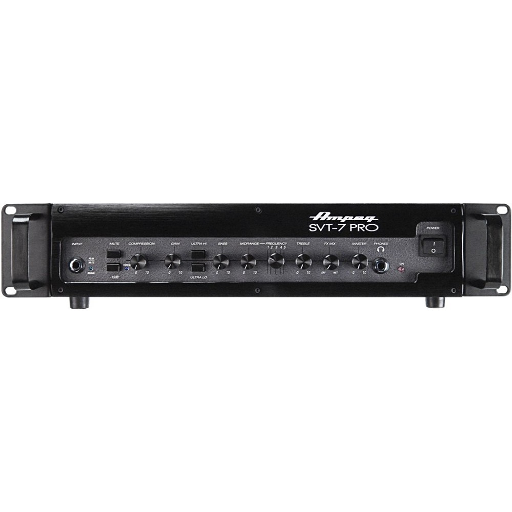 Ampeg SVT 7 PRO Rørtop Forstærker 19 rack 1000W SVT-7 PRO''en tilbyder ægte Ampeg-lyde i et kompakt design som vejer 7 kg. SVT-7 PRO''en leverer de samme professionelle egenskaber som de andre PRO-seriemodeller som inkluderer en fleksibel 5-position mid-tone control, remote switching FX loop og en onboard variable compressor. Tube preamp''en har en premium JJ 12 AX7 som fodrer den lette Class-D kraftsektion. SVT-7 PRO''en er bærbar og kan forsyne alt lige fra en lille PN-115HLF til en Heritage SVT-810E. RMS power output : 1000 watts @ 4 ohms. 600 watts @ 8 ohms. Preamp : Tube ( 1 × JJ 12AX7). Power amp : Class D. Tone controls : Bass, mid, treble. Mid-tone control : 5-position. Ultra Lo/Hi boosts. Onboard variable compressor. Transformer balanced line out. Removable rack ears inkluderet. Strømforsyning : Switching. Vægt : 7 kg.