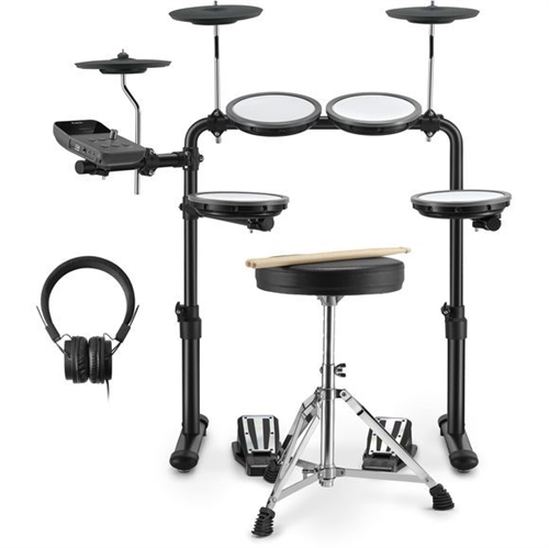 Der medfølger desuden et stabilt og multijusterbart metal-rack til at montere trommer og bækkener på, alle nødvendige kabler, en trommestol, hovedtelefoner og trommestikker. |