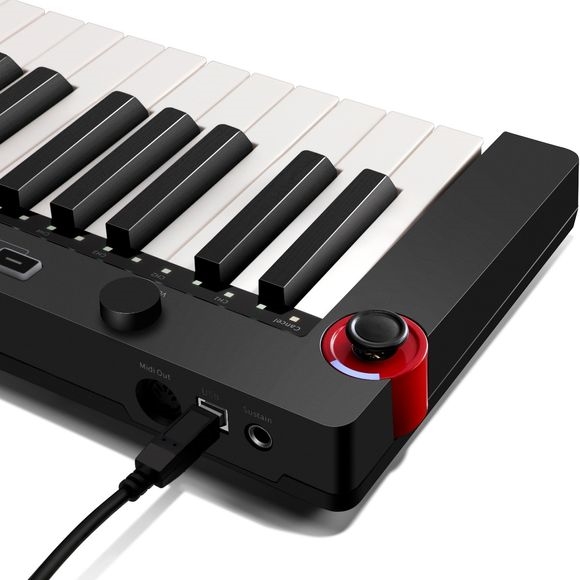 – Tilslutninger: USB-B (inkl. USB-C adapter), 5-pin MIDI OUT, sustain pedal input