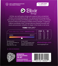 Det særlige ved Elixir-strenge er den patenterede NANOWEB coating, som beskytter strengene mod snavs, sved og korrosion. Den ultratynde coating omslutter strengene og hjælper dem med at bevare deres friske tone betydeligt længere end traditionelle ubelagte strenge.