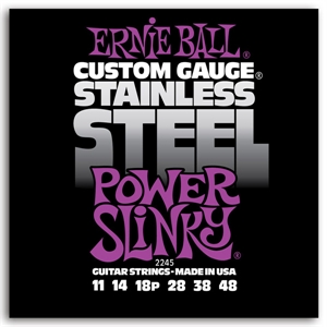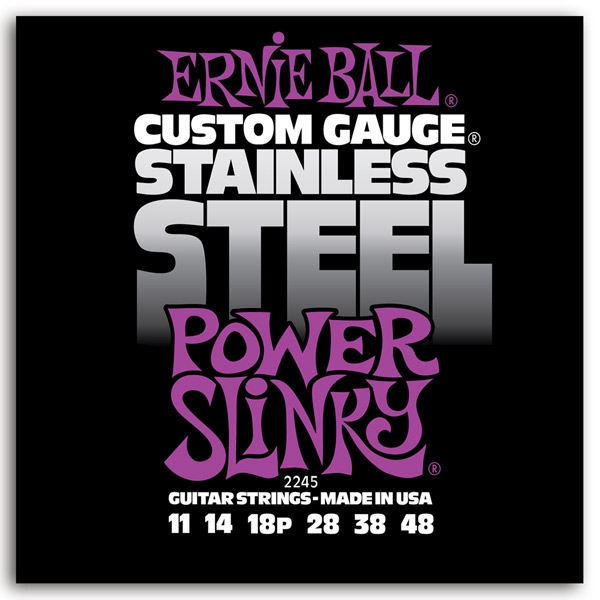 Ernie Ball 2245 Stainless Steel Power Slinky guitar strenge er fremstillet af en sekskantet, fortinnet stålkerne med vindinger af rustfrit stål.