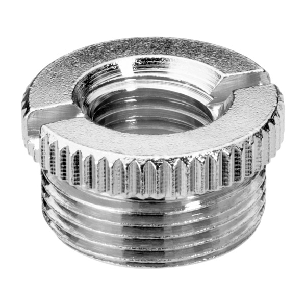 Denne adapter har udvendigt 16mm gevind, der passer til gevindet i bunden af mikrofonen og 9mm udvendigt gevind, der passer på toppen af stativets 9mm gevind.