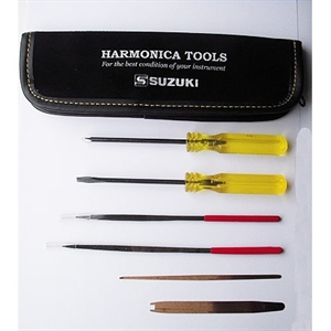Reparationskit til mundharmonika der indeholder 2 slags file, 2 slags skrutrækkere og 1 stk. special værktøj. Alt leveres i et lille læder etui.