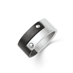 Square Ying/Yang stål ring, halv sort halv stål; assort. str.